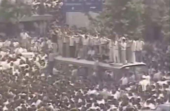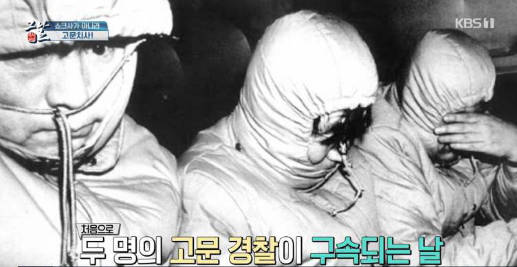 이 모습은 구속되는 고문 경찰의 신상 노출을 막기 위해 20명의 경찰이 같은 옷으로 동행한 것이다.