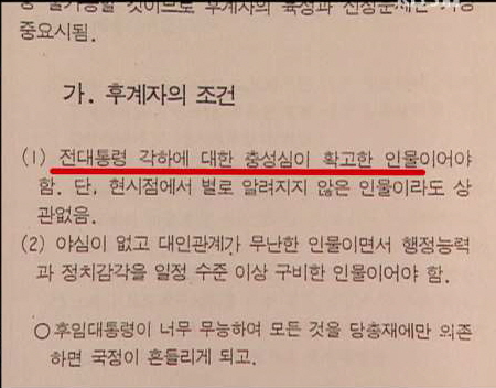 당시 여당 민정당이, 최소 2000년까지는 집권을 목표로 후계자를 육성 및 선정 방법도 구체적으로 작성되어 있었다. 후계자의 조건은 전두환에 대한 절대 충성 등이 확인되었다.